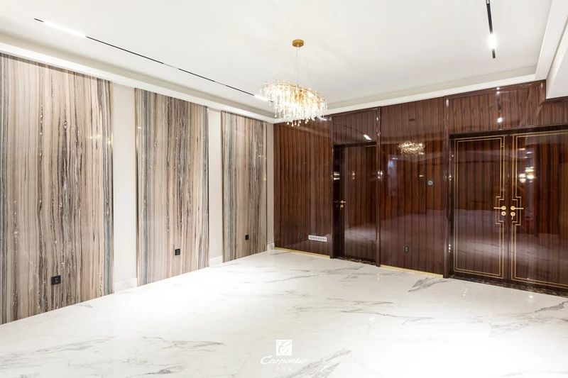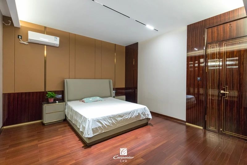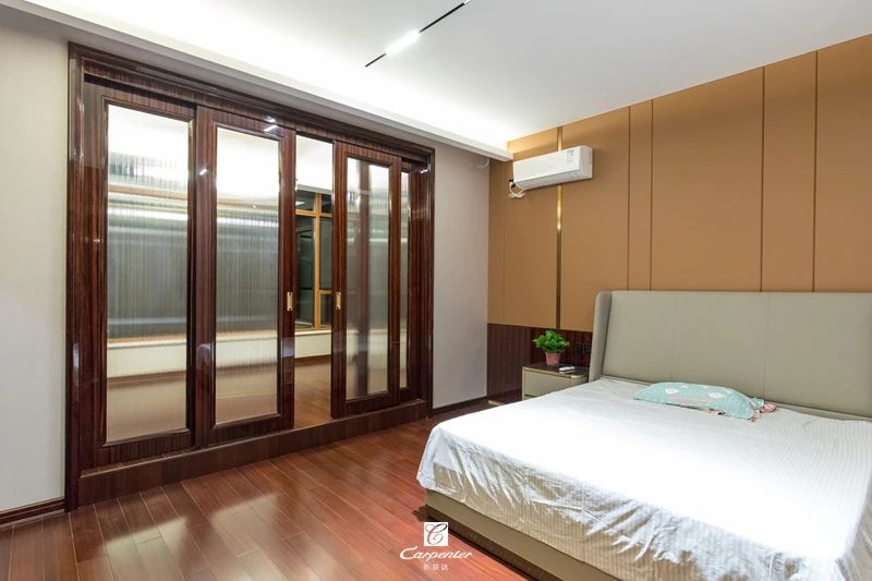 過道空間與臥室門選用黑檀木皮木飾麵