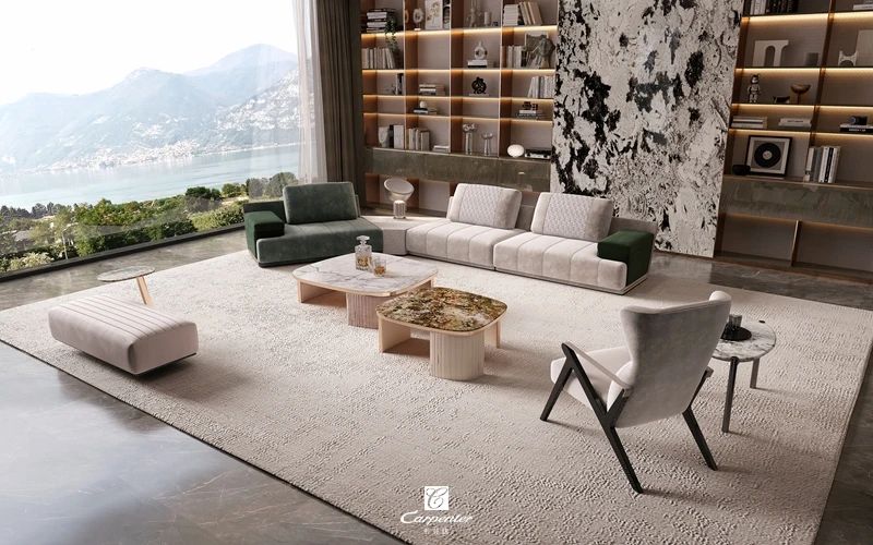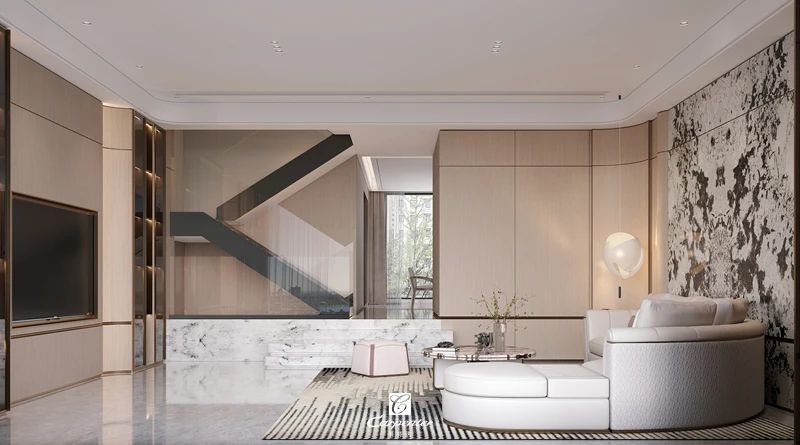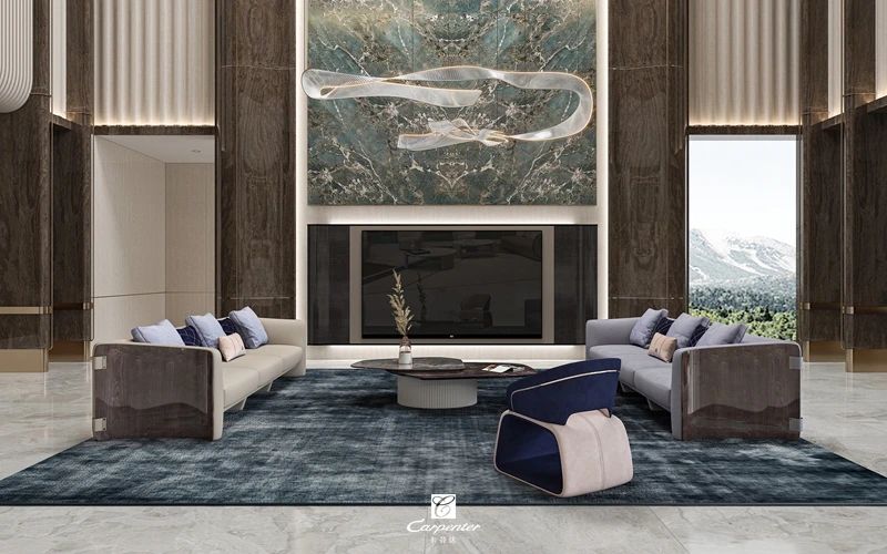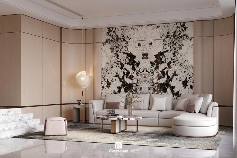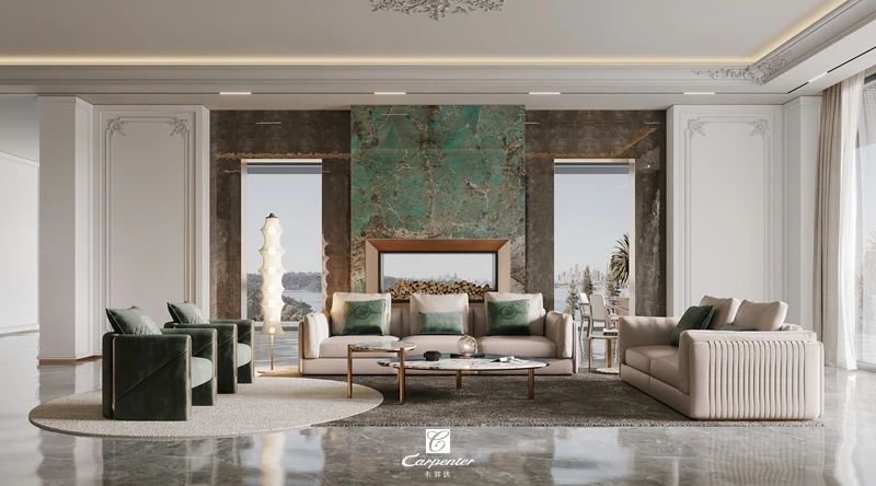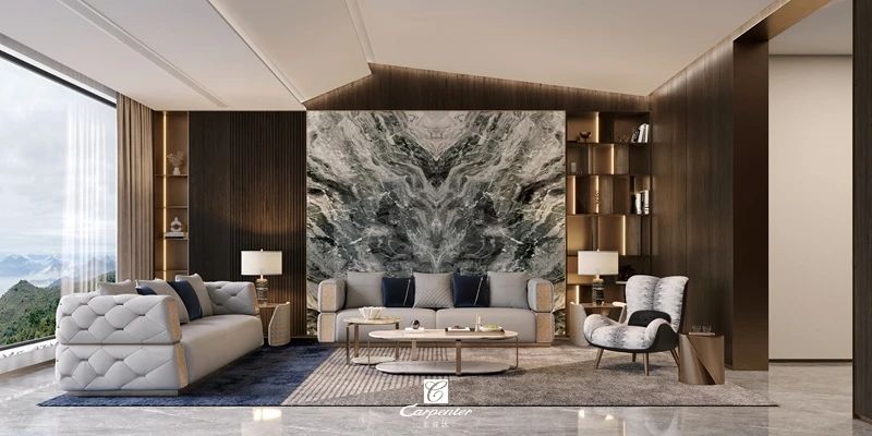 沙發背景牆(qiáng)采用翡翠色調大理石